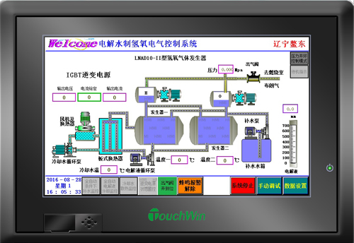 我公司負責(zé)該電解水設(shè)備的電氣系統(tǒng)的開發(fā),系統(tǒng)配置:10.1寸信捷人機界面+臺灣豐煒PLC(可編程控制器)+IGBT電解電源+壓力及液位及溫度傳感設(shè)備。操作界面設(shè)計人性化,設(shè)備動畫實時反映設(shè)備運行及故障報警狀態(tài),具有以下技術(shù)特點: