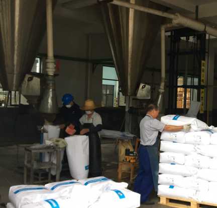 目前各染料生產(chǎn)企業(yè),在成品包裝過程中,基本上使用的是袋包裝或箱裝兩種規(guī)格,袋包裝形式為:編織袋內(nèi)襯PE塑料袋。箱裝形式為:紙箱內(nèi)襯PE塑料袋。目前企業(yè)普遍使用人工進行稱重包裝,從放料口開始接料,到放完后進行復(fù)秤及后道的扎袋、封箱(編織袋縫口)、堆碼等,各個工序均有人工處理完成,一般情況下,按照簡易化的生產(chǎn)流程,一個放料口的生產(chǎn)班組約為3~5人(見圖一)。一般情況下至少有兩個班組在生產(chǎn)(如龍盛、閏土、吉華等這些行業(yè)內(nèi)大企業(yè),基本上極少有10個以上的班組在生產(chǎn))。企業(yè)的用工量極大,與此同時,當(dāng)前的包裝工人普遍年齡在四五十歲以上,對于環(huán)境差、有污染的生產(chǎn)場所(見圖二),年輕人員基本上是趨之若鶩,因此隨著企業(yè)招工難度大、用工成本的普遍上漲以及企業(yè)對成品稱重包裝精度與合格率的不斷提升,一體化機械智能包裝已經(jīng)是一種趨勢所向,同時國家也在大力整理各項化工企業(yè)的污染問題,因此,一種智能化的機械包裝整體工程設(shè)備即將會使得各染料化工企業(yè)作為技術(shù)整改的標準所需。