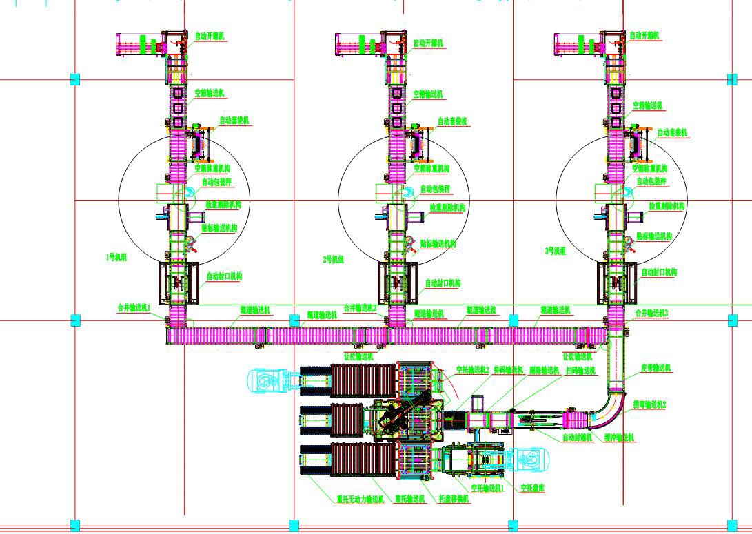 如一染料生產(chǎn)企業(yè),有6支噴塔組成的生產(chǎn)車間,想要實現(xiàn)經(jīng)濟的無人化生產(chǎn),就需要在設(shè)計中充分考慮各設(shè)備的兼容性,同時還要終盤考慮用戶的現(xiàn)場布置情況,只有這樣才可以設(shè)計組合出一套機械包裝工程(如下圖九)。